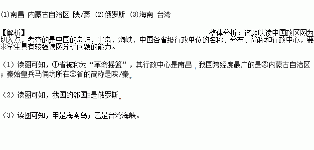 (1)①省被称为“革命摇篮”,其行政中心是 ;我国跨经度最广的是② (省级行政区名称);秦始皇兵马俑坑所在⑤省的简称是 。