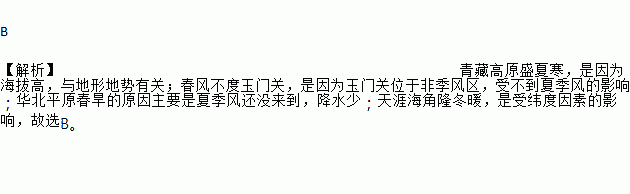 B 【解析】青藏高原盛夏寒,是因为海拔高,与地形地势有关;春风不度玉门关,是因为玉门关位于非季风区,受不到夏季风的影响;华北平原春旱的原因主要是夏季风还没来到,降水少;天涯海角隆冬暖,是受纬度因素的影响,故选B。