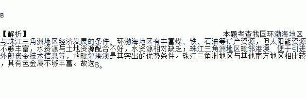 B ¡¾½âÎö¡¿±¾Ì⿼²éÎÒ¹ú»·²³º£µØÇøÓëÖé½Èý½ÇÖÞµØÇø¾¼Ã·¢Õ¹µÄÌõ¼þ¡£»·²³º£µØÇøÓзḻú¡¢Ìú¡¢Ê¯Ó͵ȿó²ú×ÊÔ´£¬µ«Ì«ÑôÄÜ×ÊÔ´²»¹»·á¸»£¬Ë®×ÊÔ´ÓëÍÁµØ×ÊÔ´ÅäºÏ²»ºÃ£¬Ë®×ÊÔ´Ïà¶Ôȱ·¦£»Öé½Èý½ÇÖÞµØÇøÅþÁÚ¸Û°Ä£¬±ãÓÚÒý½øÍⲿ×ʽð¼¼ÊõÐÅÏ¢µÈ£¬¹ÊÅþÁÚ¸Û°ÄÊÇÆäÍ»³öµÄÓÅÊÆÌõ¼þ¡£Öé½Èý½ÇÖÞµØÇøÓëÆäËûÄÏ·½µØÇøÏà±È½Ï£¬ÆäÓÐÉ«½ðÊô²»¹»·á¸»¡£¹ÊÑ¡B¡£