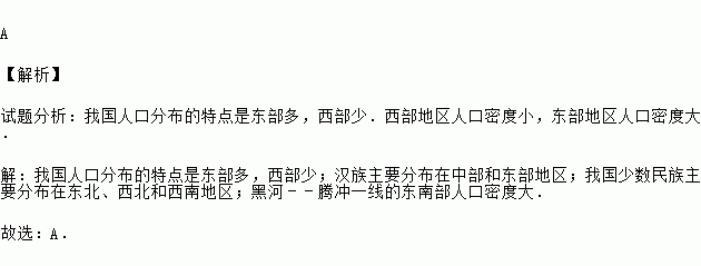A 【解析】 试题分析:我国人口分布的特点是东部多,西部少.西部地区人口密度小,东部地区人口密度大. 【解析】 我国人口分布的特点是东部多,西部少;汉族主要分布在中部和东部地区;我国少数民族主要分布在东北、西北和西南地区;黑河﹣﹣腾冲一线的东南部人口密度大. 故选:A.