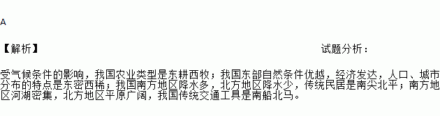 A ¡¾½âÎö¡¿ÊÔÌâ·ÖÎö£º ÊÜÆøºòÌõ¼þµÄÓ°Ï죬ÎÒ¹úũҵÀàÐÍÊǶ«¸ûÎ÷ÄÁ£»ÎÒ¹ú¶«²¿×ÔÈ»Ìõ¼þÓÅÔ½£¬¾¼Ã·¢´ï£¬È˿ڡ¢³ÇÊзֲ¼µÄÌØµãÊǶ«ÃÜÎ÷Ï¡£»ÎÒ¹úÄÏ·½µØÇø½µË®¶à£¬±±·½µØÇø½µË®ÉÙ£¬´«Í³Ãñ¾ÓÊÇÄϼⱱƽ£»ÄÏ·½µØÇøºÓºþÃܼ¯£¬±±·½µØÇøÆ½Ô¹ãÀ«£¬ÎÒ¹ú´«Í³½»Í¨¹¤¾ßÊÇÄÏ´¬±±Âí¡£
