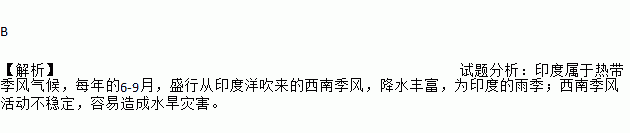 B 【解析】试题分析:印度属于热带季风气候,每年的6-9月,盛行从印度洋吹来的西南季风,降水丰富,为印度的雨季;西南季风活动不稳定,容易造成水旱灾害。