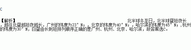 北半球冬至时,下列城市白昼由长到短排列顺序正确的是( )