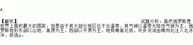A 【解析】试题分析:虽然俄罗斯是世界上面积最大的国家,但是由于其大部分地区位于北温带,其气候以温带大陆性气候为主,俄罗斯地形东部以山地、高原为主,西部以平原为主,地势南高北低,许多河流由南向北注入北冰洋,故选A。