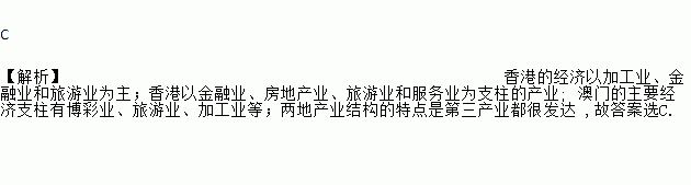 C 【解析】香港的经济以加工业、金融业和旅游业为主;香港以金融业、房地产业、旅游业和服务业为支柱的产业; 澳门的主要经济支柱有博彩业、旅游业、加工业等;两地产业结构的特点是第三产业都很发达 ,故答案选C.