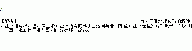 A 【解析】有关亚洲地理位置的叙述,亚洲地跨热、温、寒三带;亚洲西南隔苏伊士运河与非洲相望;亚洲是世界跨纬度最广的大洲;土耳其海峡是亚洲与欧洲的分界线,故选A。