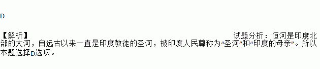 D 【解析】试题分析:恒河是印度北部的大河,自远古以来一直是印度教徒的圣河,被印度人民尊称为“圣河”和“印度的母亲”。所以本题选择D选项。