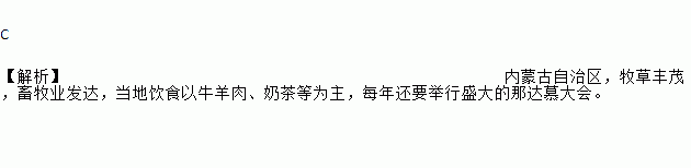 C 【解析】内蒙古自治区,牧草丰茂,畜牧业发达,当地饮食以牛羊肉、奶茶等为主,每年还要举行盛大的那达慕大会。