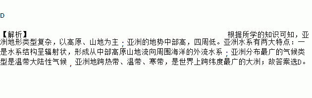 D ¡¾½âÎö¡¿¸ù¾ÝËùѧµÄ֪ʶ¿ÉÖª£¬ÑÇÖÞµØÐÎÀàÐ͸´ÔÓ£¬ÒÔ¸ßÔ¡¢É½µØÎªÖ÷£»ÑÇÖ޵ĵØÊÆÖв¿¸ß£¬ËÄÖܵ͡£ÑÇÖÞˮϵÓÐÁ½´óÌØµã£ºÒ»ÊÇˮϵ½á¹¹³Ê·øÉä×´£¬ÐγɴÓÖв¿¸ßÔɽµØÁ÷ÏòÖÜΧº£ÑóµÄÍâÁ÷ˮϵ£»ÑÇÖÞ·Ö²¼×î¹ãµÄÆøºòÀàÐÍÊÇδø´ó½ÐÔÆøºò£¬ÑÇÖ޵ؿçÈÈ´ø¡¢Î´ø¡¢º®´ø£¬ÊÇÊÀ½çÉÏ¿çγ¶È×î¹ãµÄ´óÖÞ£»¹Ê´ð°¸Ñ¡D¡£