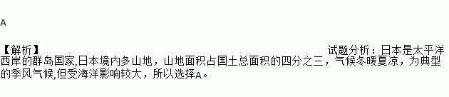 A 【解析】试题分析:日本是太平洋西岸的群岛国家,日本境内多山地,山地面积占国土总面积的四分之三,气候冬暖夏凉,为典型的季风气候,但受海洋影响较大,所以选择A。