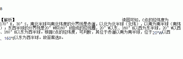 C. C点位于北半球 D. C点位于东半球