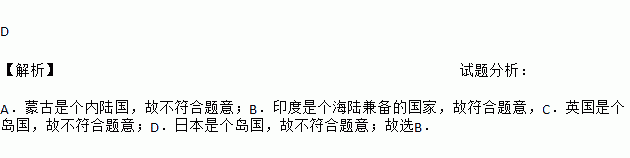D 【解析】试题分析: A.蒙古是个内陆国,故不符合题意;B.印度是个海陆兼备的国家,故符合题意,C.英国是个岛国,故不符合题意;D.日本是个岛国,故不符合题意;故选B.