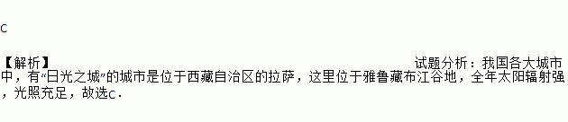 C 【解析】试题分析:我国各大城市中,有“日光之城”的城市是位于西藏自治区的拉萨,这里位于雅鲁藏布江谷地,全年太阳辐射强,光照充足,故选C.