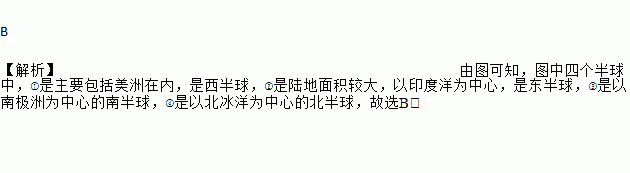 B 【解析】由图可知,图中四个半球中,①是主要包括美洲在内,是西半球,②是陆地面积较大,以印度洋为中心,是东半球,③是以南极洲为中心的南半球,④是以北冰洋为中心的北半球,故选B。