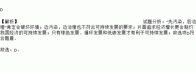 D ¡¾½âÎö¡¿ÊÔÌâ·ÖÎö£º¡°ÏÈÎÛȾ£¬ºóÖÎÀí¡±¿Ï¶¨»áÆÆ»µ»·¾³£»±ßÎÛȾ£¬±ßÖÎÀíÒ²²»·ûºÏ¿É³ÖÐø·¢Õ¹µÄÒªÇ󣻯¬Ãæ×·Çó¾¼ÃÔö³¤¸ü»áÖÆÔ¼ÎÒ¹ú¾¼ÃµÄ¿É³ÖÐø·¢Õ¹£»Ö»ÓÐÂÌÉ«·¢Õ¹¡¢Ñ»··¢Õ¹ºÍµÍ̼·¢Õ¹²ÅÓÐÀûÓڿɳÖÐø·¢Õ¹£»¹ÊÑ¡ÏîD·ûºÏÌâÒ⣮ ¹ÊÑ¡£ºD£®