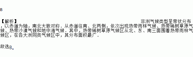 B ¡¾½âÎö¡¿·ÇÖÞÆøºòÀàÐͳʴø×´·Ö²¼£¬ÒÔ³àµÀΪÖᣬÄϱ±´óÖ¶Գƣ®´Ó³àµÀÍùÄÏ¡¢±±Á½²à£¬ÒÀ´Î³öÏÖÈÈ´øÓêÁÖÆøºò¡¢ÈÈ´øÏ¡Ê÷²ÝÔÆøºò¡¢ÈÈ´øÉ³Ä®ÆøºòºÍµØÖк£Æøºò£®ÆäÖУ¬ÈÈ´øÏ¡Ê÷²ÝÔÆøºòÇø´Ó±±¡¢¶«¡¢ÄÏÈýÃæÎ§×ÅÈÈ´øÓêÁÖÆøºòÇø£¬ÔÚ¸÷´óÖÞͬÀàÆøºòÇøÖУ¬Æä·Ö²¼Ãæ»ý×î¹ã£® ¹ÊÑ¡B¡£