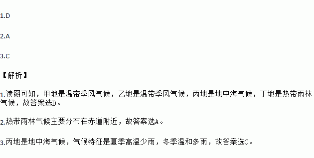 1.D 2.A 3.C 【解析】 1.读图可知,甲地是温带季风气候,乙地是温带季风气候,丙地是地中海气候,丁地是热带雨林气候,故答案选D。 2.热带雨林气候主要分布在赤道附近,故答案选A。 3.丙地是地中海气候,气候特征是夏季高温少雨,冬季温和多雨,故答案选C。