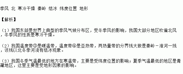 (2)我国温度带③和温度带④的分界线大致是_________(山脉)——淮河一线,该线以北冬季河流有________(结冰或不结冰)现象。