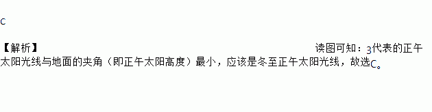 C 【解析】读图可知:3代表的正午太阳光线与地面的夹角(即正午太阳高度)最小,应该是冬至正午太阳光线,故选C。