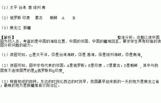 (1)太平 台湾 渤 琼州 南 (2)俄罗斯 印度 蒙古 朝鲜A B (3)黑龙江 新疆 【解析】整体分析:该题以读中国图为切入点,考查的是中国的海陆位置、中国的邻国、中国的疆域四至,要求学生具有较强的读图分析问题的能力。 (1)读图可知,①是太平洋,②是台湾海峡,③是渤海,④是琼州海峡,⑤是南海。 (2)读图可知,...