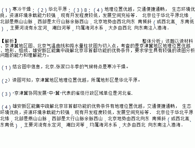 £¨1£©º®Àä¸ÉÔ£¨2£©»ª±±Æ½Ô£»£¨3£©B£»£¨4£©µØÀíλÖÃÓÅÔ½£¬½»Í¨±ã½Ýͨ³©£¬ Éú̬»·¾³ÓÅÁ¼£¬×ÊÔ´»·¾³³ÐÔØÄÜÁ¦½ÏÇ¿£¬ÏÖÓпª·¢³Ì¶È½ÏµÍ£¬·¢Õ¹¿Õ¼ä³äÔ£µÈ£® ±±¾©Î»ÓÚ»ª±±Æ½Ô±±Ôµ£¬±±²¿ÊÇÑàɽɽÂö£¬Î÷²¿ÊÇÌ«ÐÐɽÂöÓàÂöÎ÷ɽ£®±±¾©µØÊÆÓÉÎ÷±±Ïò¶« ÄÏÇãб£¨»òÎ÷±±¸ß¡¢¶«Äϵͣ©£¬Ö÷ÒªºÓÁ÷ÓÐÓÀ¶¨ºÓ¡¢³±°×ºÓµÈ£¬¾ùÊôº£ºÓˮϵ£¬´ó¶àÓÉÎ÷±± Ïò¶«ÄÏ×¢Èë²³º££® ¡¾½âÎö¡¿ÕûÌå·ÖÎö£º¸ÃÌâÒÔ¶Á²ÄÁÏ¡¢¾©½ò¼½µØÇøÍ¼¡¢±±¾©ÆøÎÂÇúÏߺͽµ...