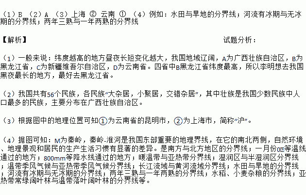 (1)B (2)A (3)上海 ② 云南 ① (4)例如:水田与旱地的分界线;河流有冰期与无冰期的分界线;两年三熟与一年两熟的分界线 【解析】试题分析: (1)一般来说:纬度越高的地方昼夜长短变化越大,我国地域辽阔,A为广西壮族自治区,B为黑龙江省,C为新疆维吾尔自治区,D为云南省。四省中B黑龙江省纬度最高,所以李明想去我国黑夜最长的地方,最好去黑龙江省。 (2)我国共有56个民...