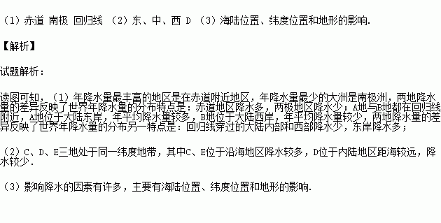 (2)C、D、E分别处于亚欧大陆的________部、_________部和________部,其中降水较少的是_________地。