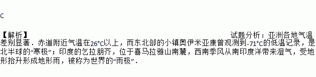 C 【解析】试题分析:亚洲各地气温差别显著.赤道附近气温在26°C以上,而东北部的小镇奥伊米亚康曾观测到-71°C的低温记录,是北半球的“寒极”;印度的乞拉朋齐,位于喜马拉雅山南麓,西南季风从南印度洋带来湿气,受地形抬升形成地形雨,被称为世界的“雨极”.