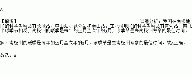 A 【解析】试题分析:我国在南极地区的科学考察站有长城站、中山站、昆仑站和泰山站,在北极地区的科学考察站有黄河站.南北半球季节相反,南极洲的暖季是每年的11月至次年的3月,该季节是去南极洲考察的最佳时间. 【解析】 南极洲的暖季是每年的11月至次年的3月,该季节是去南极洲考察的最佳时间,故A正确. 故选:A.
