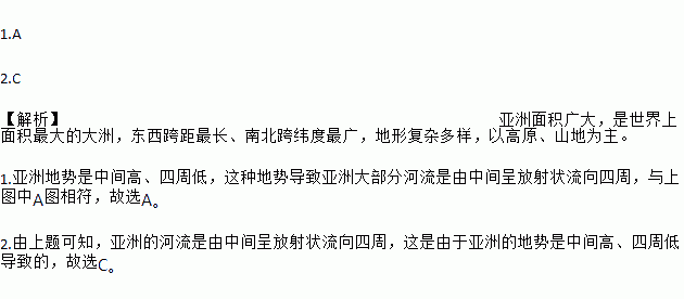 1.A 2.C ¡¾½âÎö¡¿ÑÇÖÞÃæ»ý¹ã´ó£¬ÊÇÊÀ½çÉÏÃæ»ý×î´óµÄ´óÖÞ£¬¶«Î÷¿ç¾à×¡¢Äϱ±¿çγ¶È×î¹ã£¬µØÐθ´ÔÓ¶àÑù£¬ÒÔ¸ßÔ¡¢É½µØÎªÖ÷¡£ 1.ÑÇÖÞµØÊÆÊÇÖмä¸ß¡¢ËÄÖܵͣ¬ÕâÖÖµØÊƵ¼ÖÂÑÇÖ޴󲿷ֺÓÁ÷ÊÇÓÉÖмä³Ê·ÅÉä×´Á÷ÏòËÄÖÜ£¬ÓëÉÏͼÖÐAͼÏà·û£¬¹ÊÑ¡A¡£ 2.ÓÉÉÏÌâ¿ÉÖª£¬ÑÇÖ޵ĺÓÁ÷ÊÇÓÉÖмä³Ê·ÅÉä×´Á÷ÏòËÄÖÜ£¬ÕâÊÇÓÉÓÚÑÇÖ޵ĵØÊÆÊÇÖмä¸ß¡¢ËÄÖܵ͵¼Öµģ¬¹ÊÑ¡C¡£