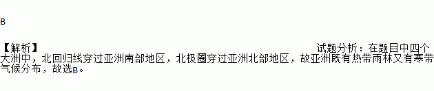 B 【解析】试题分析:在题目中四个大洲中,北回归线穿过亚洲南部地区,北极圈穿过亚洲北部地区,故亚洲既有热带雨林又有寒带气候分布,故选B。大洲是大陆和它附近岛屿的合称,那么全球应该有