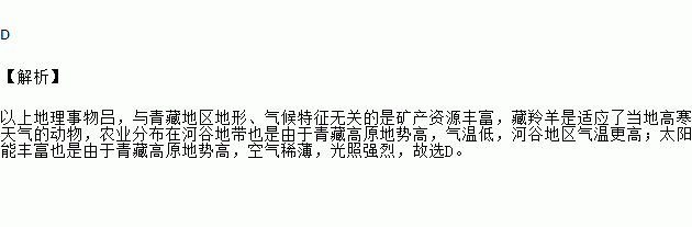 A. 藏羚羊 B. 农业多分布于河谷地带 C. 太阳能丰富 D. 矿产资源丰富