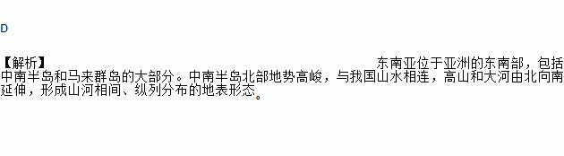 D 【解析】东南亚位于亚洲的东南部,包括中南半岛和马来群岛的大部分。中南半岛北部地势高峻,与我国山水相连,高山和大河由北向南延伸,形成山河相间、纵列分布的地表形态。