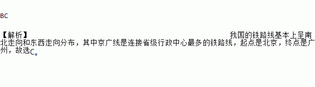 BC 【解析】我国的铁路线基本上呈南北走向和东西走向分布,其中京广线是连接省级行政中心最多的铁路线,起点是北京,终点是广州,故选C。