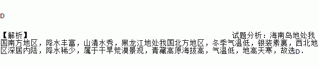 D 【解析】试题分析:海南岛地处我国南方地区,降水丰富,山清水秀,黑龙江地处我国北方地区,冬季气温低,银装素裹,西北地区深居内陆,降水稀少,属于干旱荒漠景观,青藏高原海拔高,气温低,地高天寒,故选D.