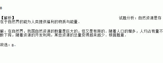 B 【解析】试题分析:自然资源是存在于自然界的能为人类提供福利的物质与能量. 【解析】 在自然界,我国自然资源的数量是巨大的,但又是有限的.随着人口的增多,人均占有量不断下降,随着资源的开发利用,某些资源的总量变得越来越少.根据题意. 故选:B.