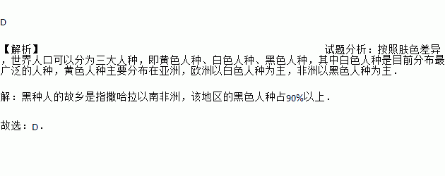 D 【解析】试题分析:按照肤色差异,世界人口可以分为三大人种,即黄色人种、白色人种、黑色人种,其中白色人种是目前分布最广泛的人种,黄色人种主要分布在亚洲,欧洲以白色人种为主,非洲以黑色人种为主. 【解析】 黑种人的故乡是指撒哈拉以南非洲,该地区的黑色人种占90%以上. 故选:D.
