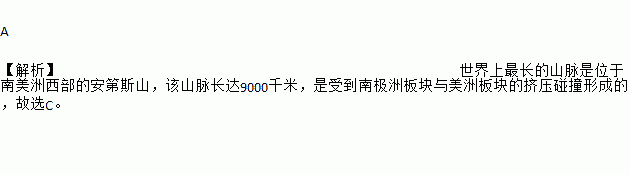 A 【解析】世界上最长的山脉是位于南美洲西部的安第斯山,该山脉长达9000千米,是受到南极洲板块与美洲板块的挤压碰撞形成的,故选C。