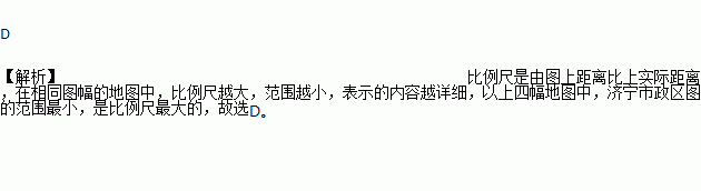 下列地图图幅大小相等,其中比例尺最大的是( )