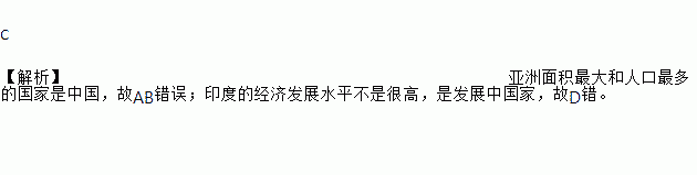 C 【解析】亚洲面积最大和人口最多的国家是中国,故AB错误;印度的经济发展水平不是很高,是发展中国家,故D错。