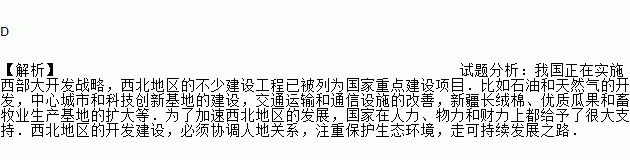D 【解析】试题分析:我国正在实施西部大开发战略,西北地区的不少建设工程已被列为国家重点建设项目.比如石油和天然气的开发,中心城市和科技创新基地的建设,交通运输和通信设施的改善,新疆长绒棉、优质瓜果和畜牧业生产基地的扩大等.为了加速西北地区的发展,国家在人力、物力和财力上都给予了很大支持.西北地区的开发建设,必须协调人地关系,注重保护生态环境,走可持续发展之路.