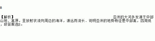 B 【解析】亚洲的大河多发源于中部山地、高原,呈放射状流向周边的海洋,源远而流长.说明亚洲的地势特征是中部高,四周低,故答案选B。