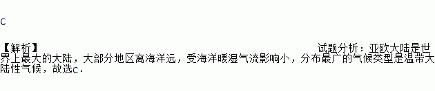 C 【解析】试题分析:亚欧大陆是世界上最大的大陆,大部分地区离海洋远,受海洋暖湿气流影响小,分布最广的气候类型是温带大陆性气候,故选C.