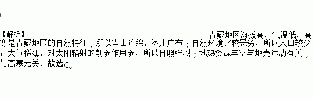A. 雪山连绵、冰川广布 B. 日照强烈 C. 地热资源丰富 D. 人口较少