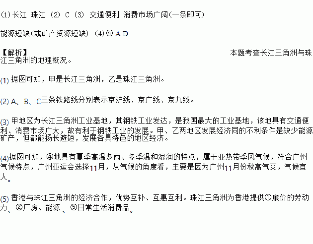 (1)³¤½ Öé½ (2) C (3) ½»Í¨±ãÀû Ïû·ÑÊг¡¹ãÀ«(Ò»Ìõ¼´¿É) ÄÜÔ´¶Ìȱ(»ò¿ó²ú×ÊÔ´¶Ìȱ) (4)¢Ü A D ¡¾½âÎö¡¿ ±¾Ì⿼²é³¤½Èý½ÇÖÞÓëÖé½Èý½ÇÖ޵ĵØÀí¸Å¿ö¡£ (1) ¾Ýͼ¿ÉÖª£¬¼×Êdz¤½Èý½ÇÖÞ£¬ÒÒÊÇÖé½Èý½ÇÖÞ¡£ (2) A¡¢B¡¢CÈýÌõÌú·Ïß·Ö±ð±íʾ¾©»¦Ïß¡¢¾©¹ãÏß¡¢¾©¾ÅÏß¡£ (3) ¼×µØÇøÎª³¤½Èý½ÇÖÞ¹¤Òµ»ùµØ£¬Æä¸ÖÌú¹¤Òµ·¢´ï£¬ÊÇÎÒ¹ú×î´óµÄ¹¤Òµ»ùµØ£¬¸ÃµØ¾ßÓÐ...