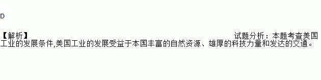 D 【解析】试题分析:本题考查美国工业的发展条件,美国工业的发展受益于本国丰富的自然资源、雄厚的科技力量和发达的交通。