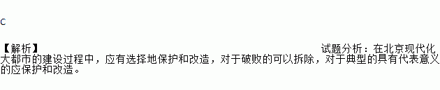 C 【解析】试题分析:在北京现代化大都市的建设过程中,应有选择地保护和改造,对于破败的可以拆除,对于典型的具有代表意义的应保护和改造。