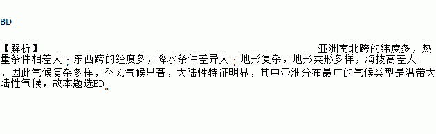 BD 【解析】亚洲南北跨的纬度多,热量条件相差大;东西跨的经度多,降水条件差异大;地形复杂,地形类形多样,海拔高差大,因此气候复杂多样,季风气候显著,大陆性特征明显,其中亚洲分布最广的气候类型是温带大陆性气候,故本题选BD。