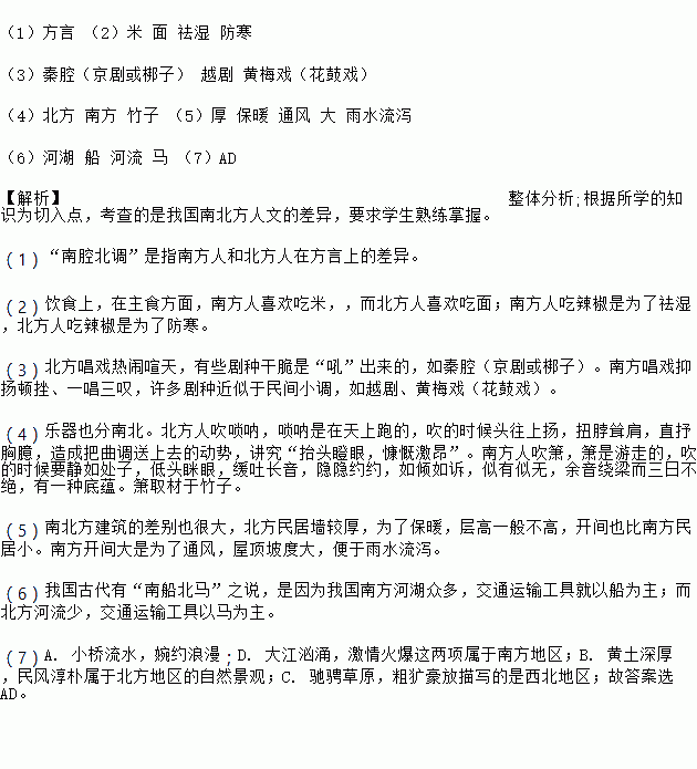 (2)饮食上,在主食方面,南方人喜欢吃_______,而北方人喜欢吃_______;南方人吃辣椒是为了_______,北方人吃辣椒是为了_______。