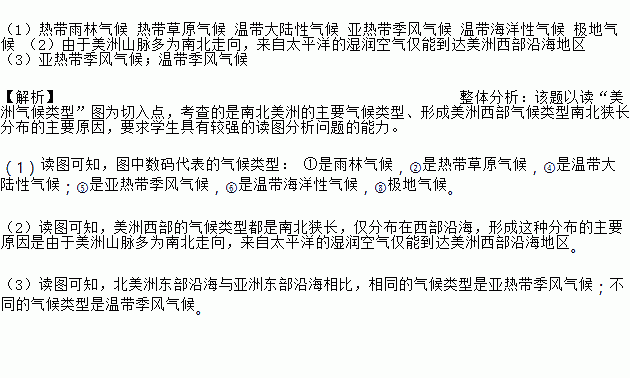(1)热带雨林气候 热带草原气候 温带大陆性气候 亚热带季风气候 温带海洋性气候 极地气候 (2)由于美洲山脉多为南北走向,来自太平洋的湿润空气仅能到达美洲西部沿海地区 (3)亚热带季风气候;温带季风气候 【解析】整体分析:该题以读“美洲气候类型”图为切入点,考查的是南北美洲的主要气候类型、形成美洲西部气候类型南北狭长分布的主要原因,要求学生具有较强的读图分析问题的能力。 (1)读图可...